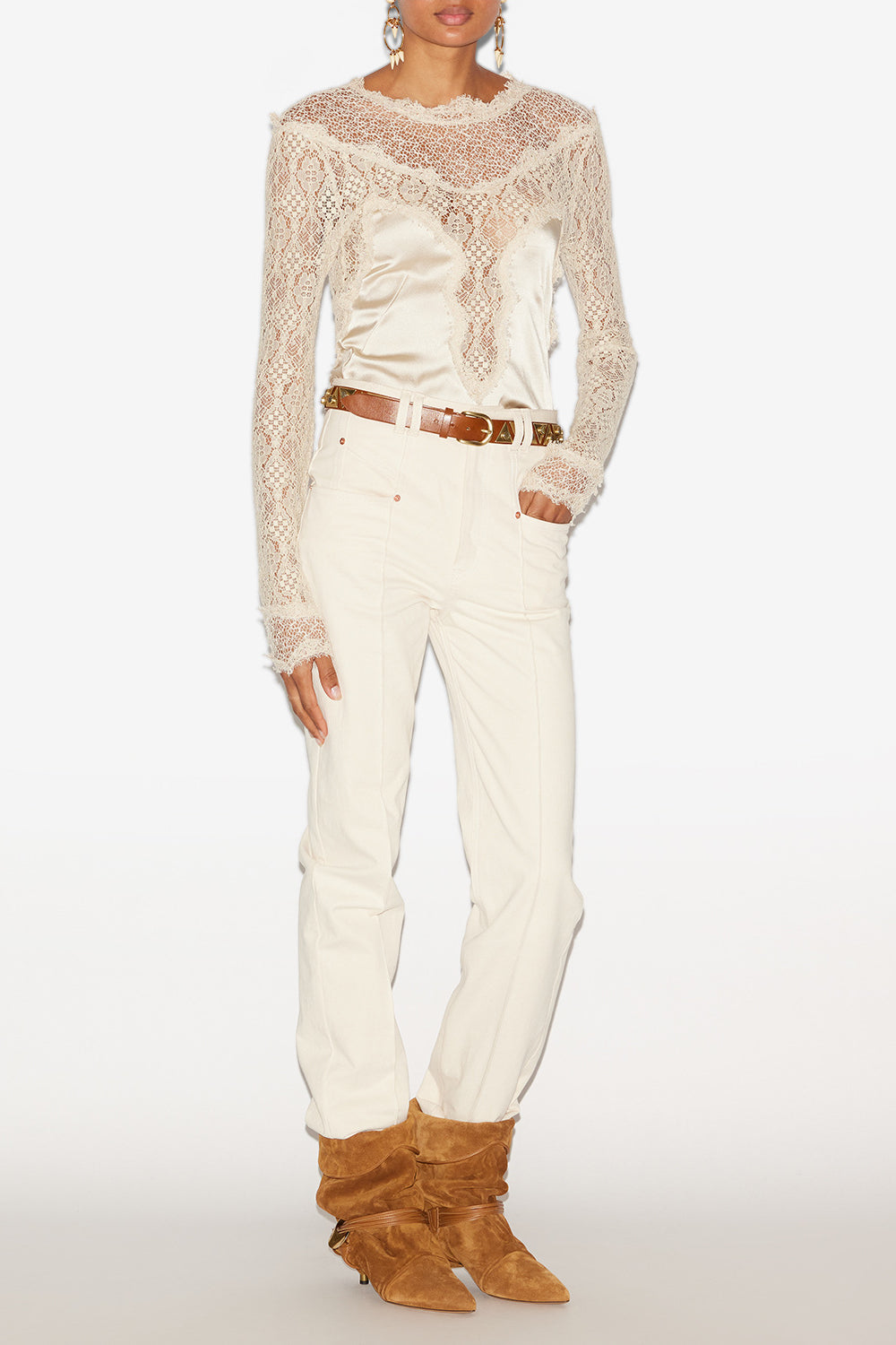 Acabados de galones de encaje en el escote y la parte inferior de las mangas