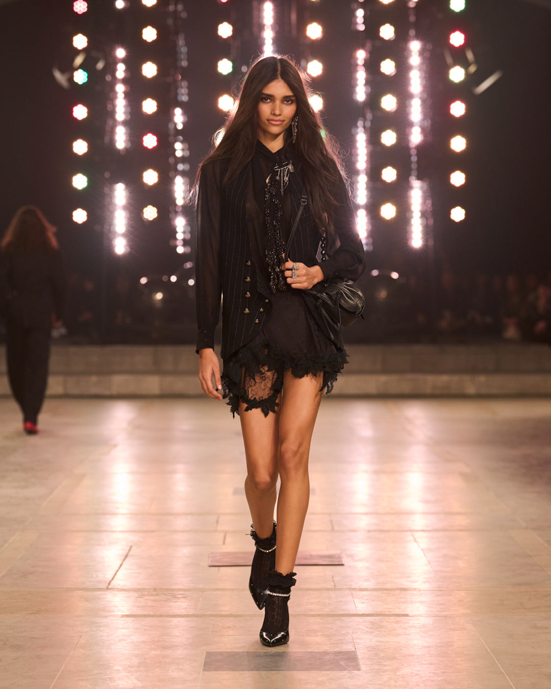 이자벨 마랑의 시그니처 코드와 뉴웨이브의 엣지가 조화를 이룬 이 도시 소녀는 시스루 기퓌르, 블랙 컬러의 화이트 가죽 앵클부츠, 체인과 안전핀으로 만든 장인적인 액세서리로 런웨이를 누빕니다.