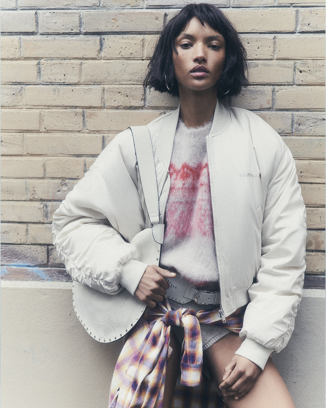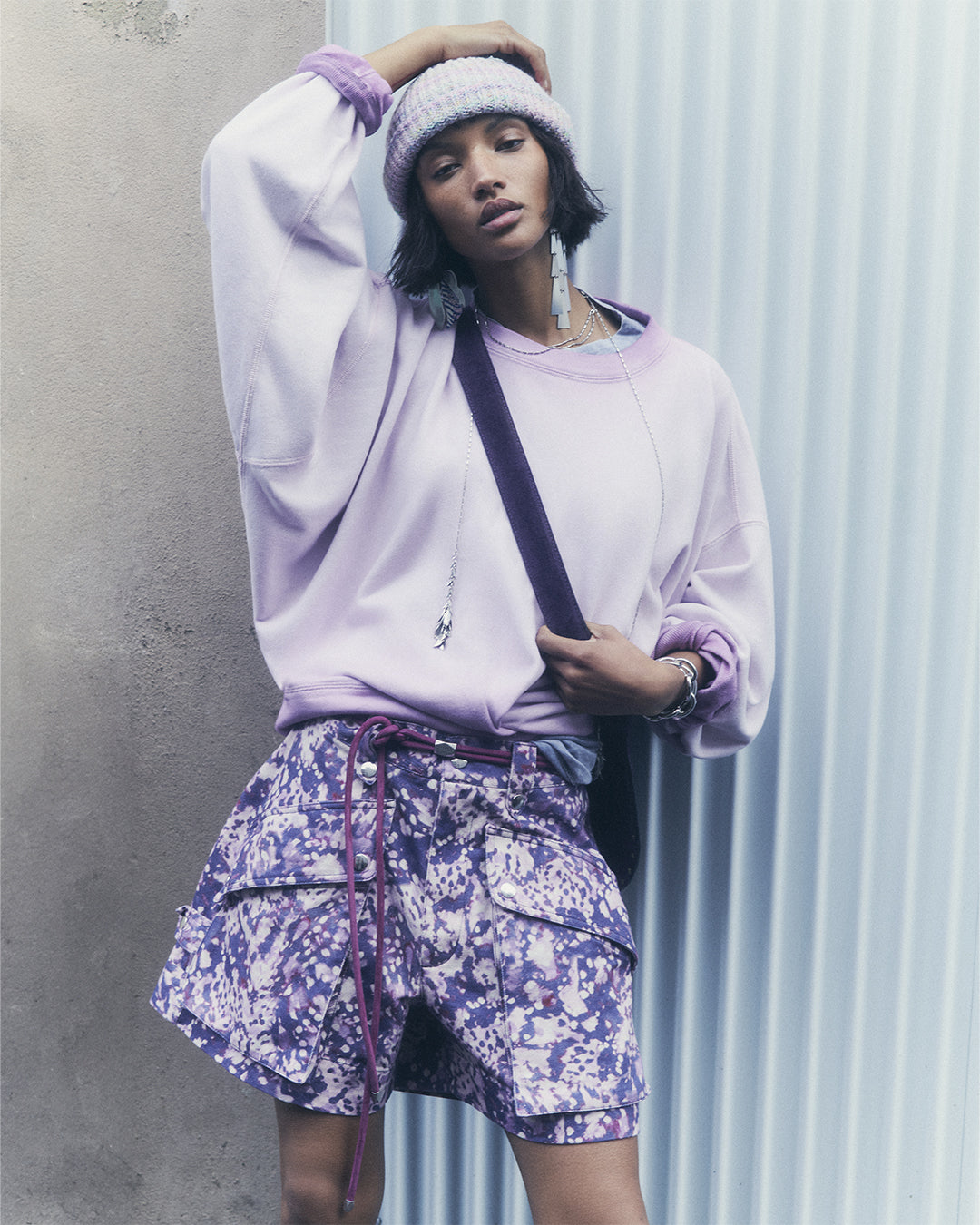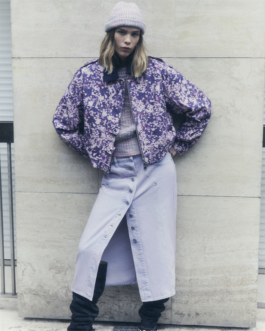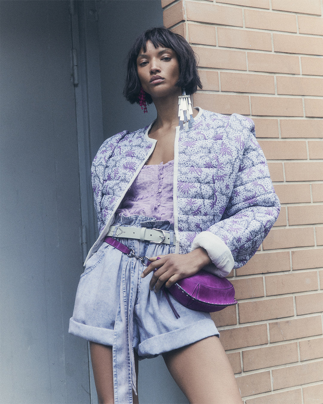She wears a bomber jacket with knit culotte shorts, a cocktail dress with studded ballet flats, and a pair of zebra-print socks, seamlessly mixing plaids and stripes. The effortless Etoile essentials take on boxy proportions, with acid-washed denim, to a lilac hue that punctuates the collection.