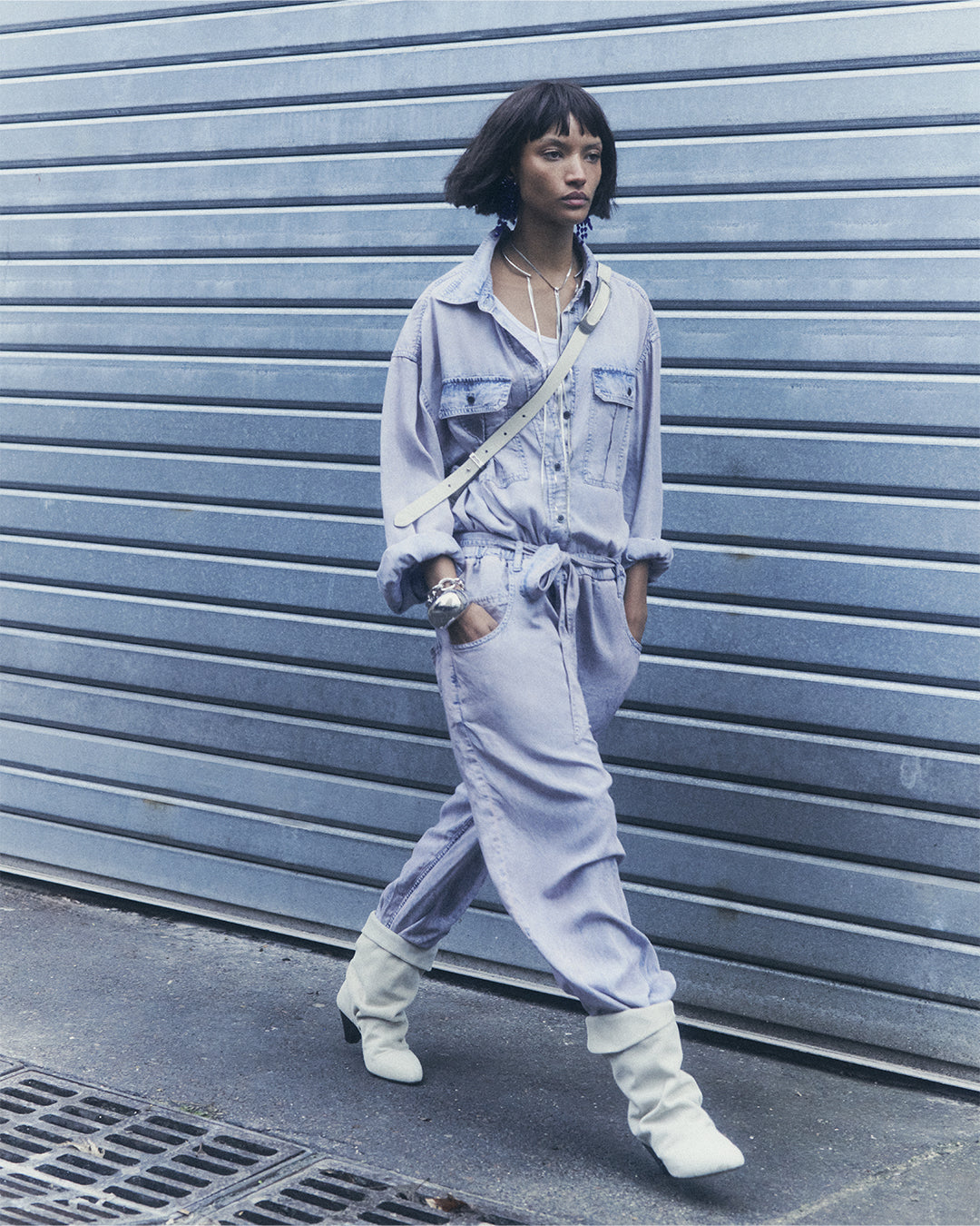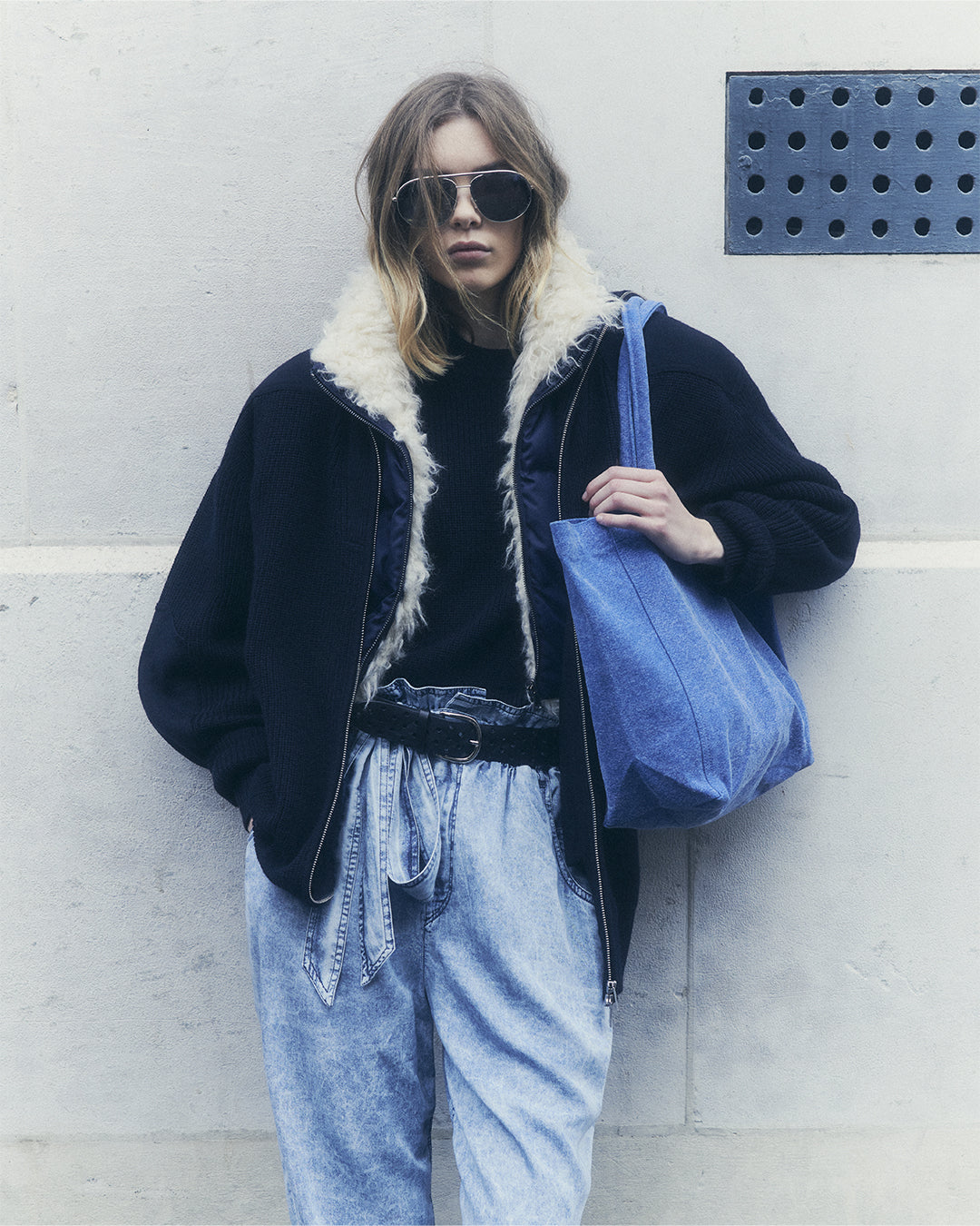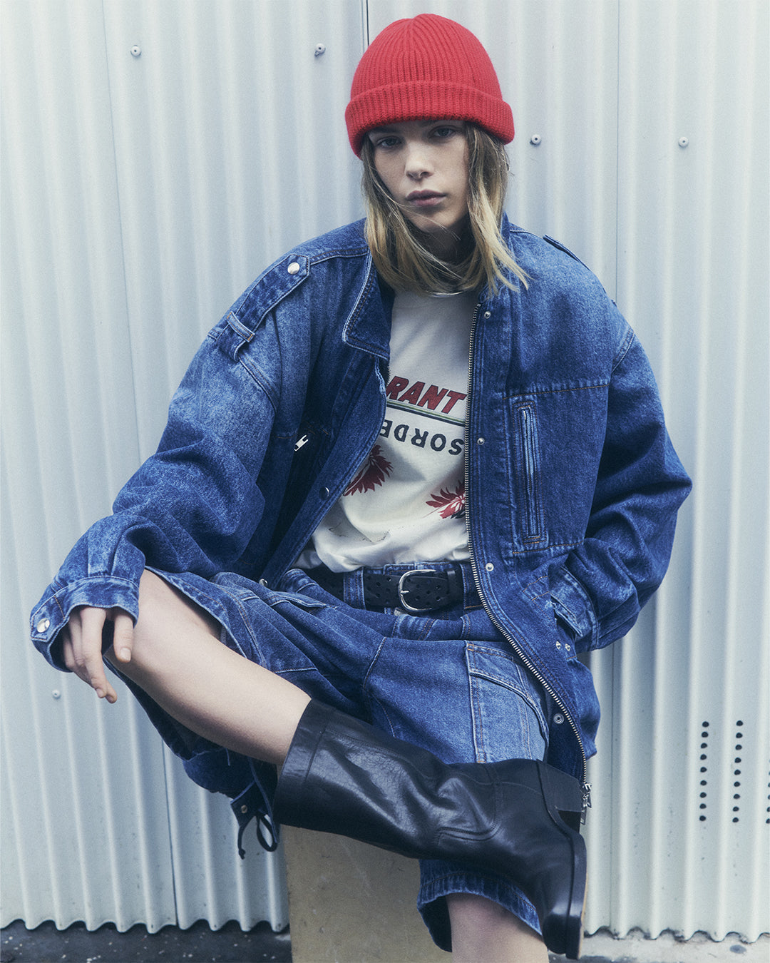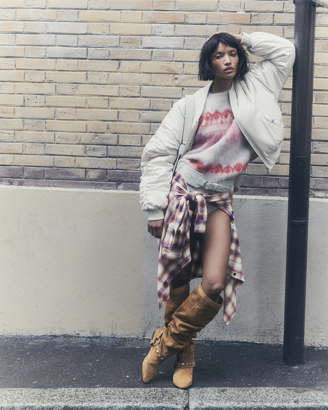 She wears a bomber jacket with knit culotte shorts, a cocktail dress with studded ballet flats, and a pair of zebra-print socks, seamlessly mixing plaids and stripes. The effortless Etoile essentials take on boxy proportions, with acid-washed denim, to a lilac hue that punctuates the collection.