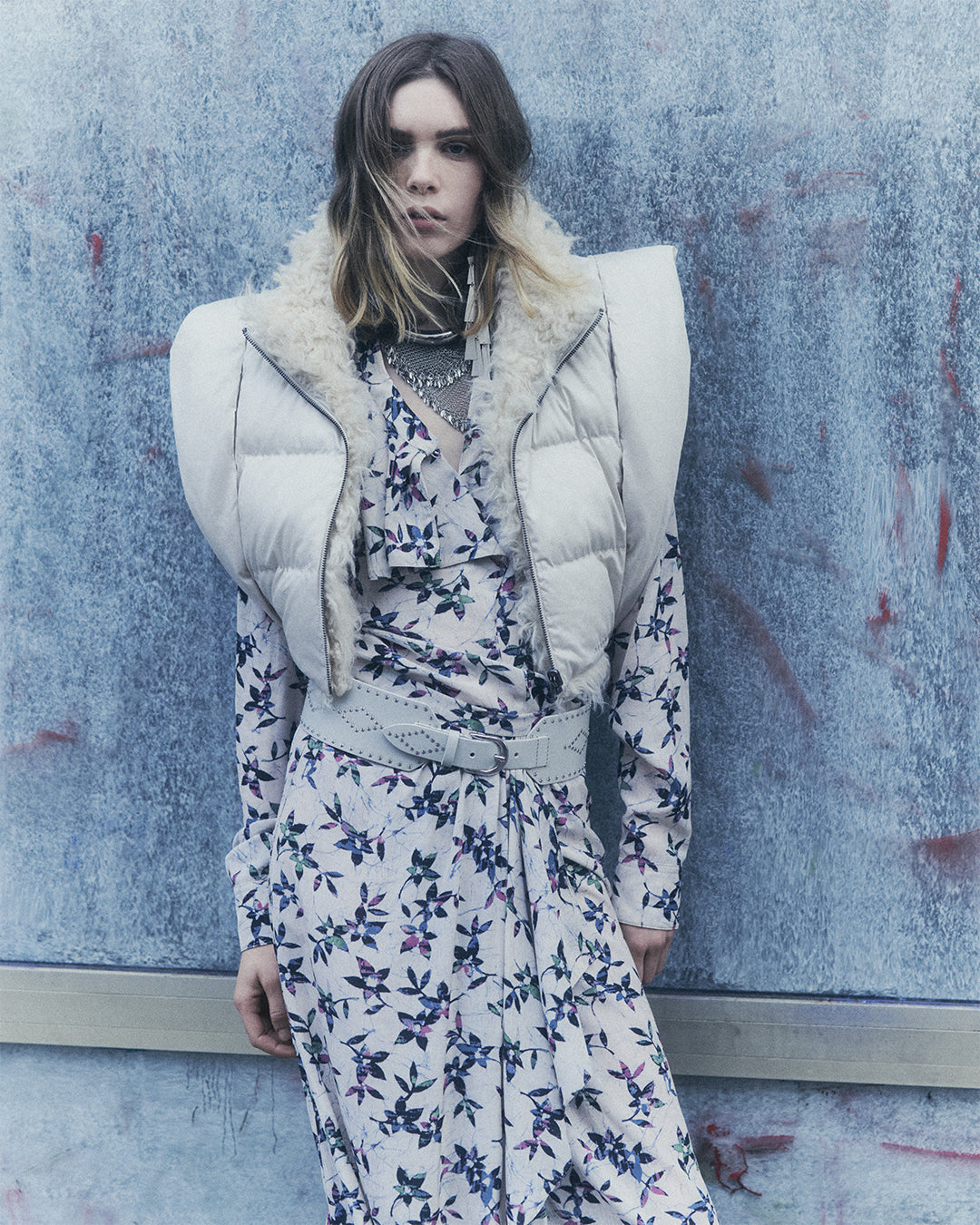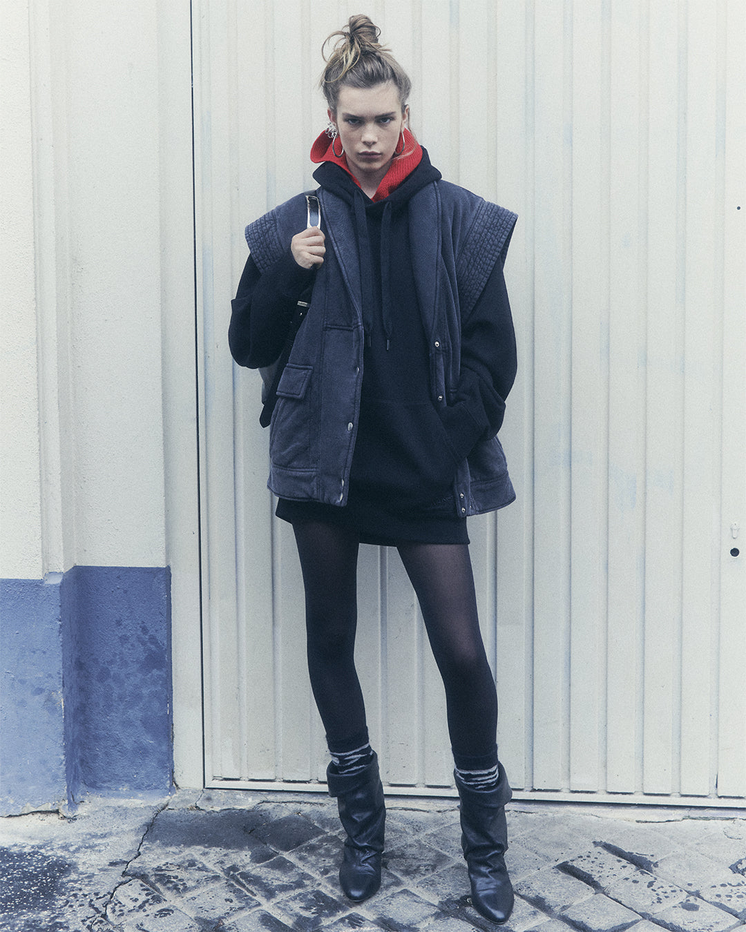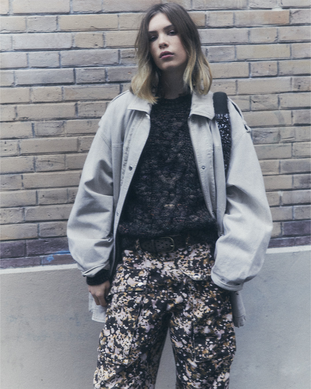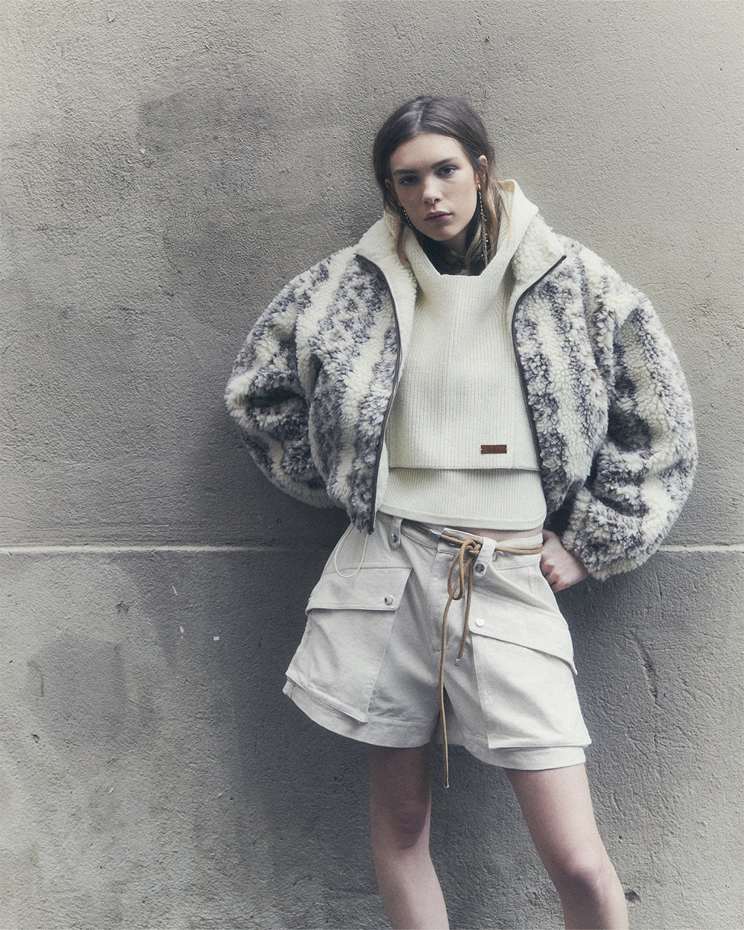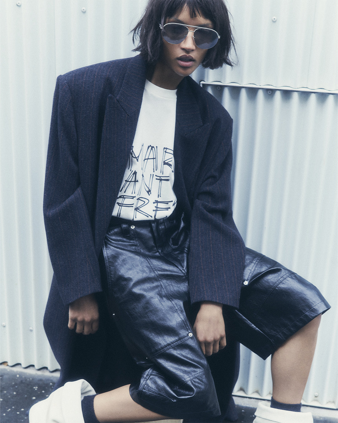 She wears a bomber jacket with knit culotte shorts, a cocktail dress with studded ballet flats, and a pair of zebra-print socks, seamlessly mixing plaids and stripes. The effortless Etoile essentials take on boxy proportions, with acid-washed denim, to a lilac hue that punctuates the collection.