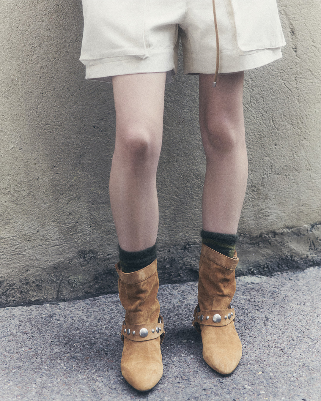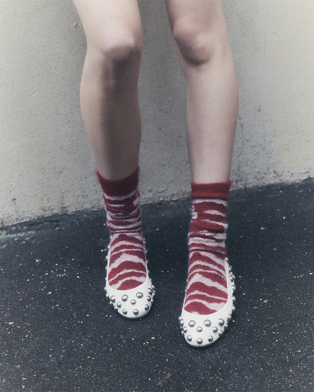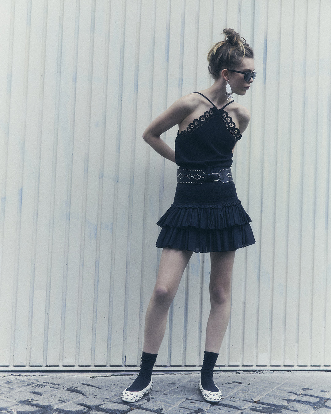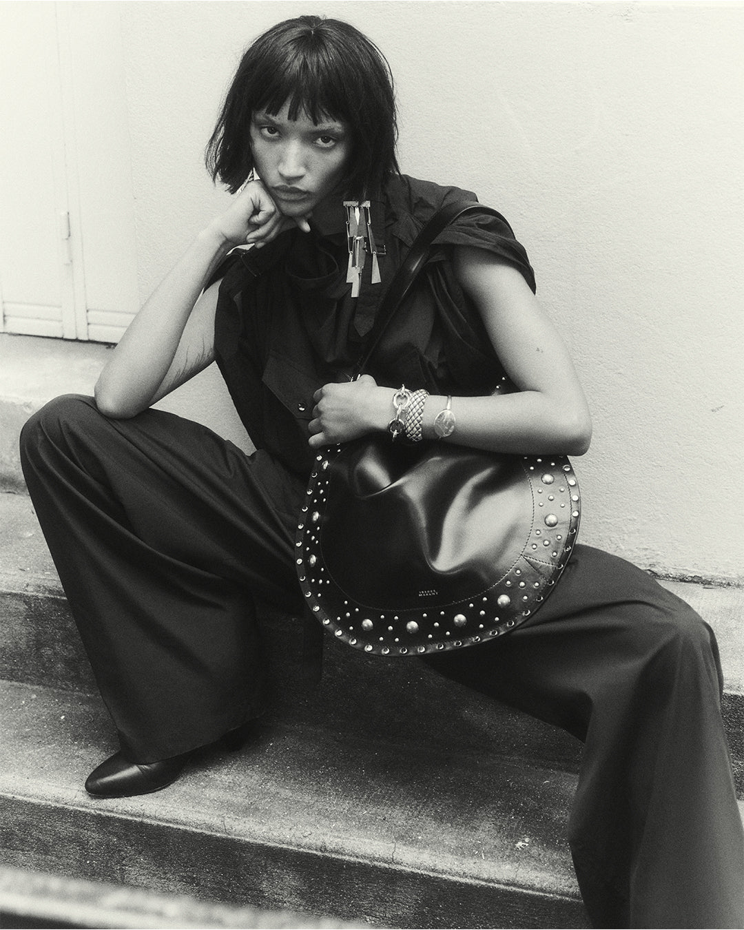 She wears a bomber jacket with knit culotte shorts, a cocktail dress with studded ballet flats, and a pair of zebra-print socks, seamlessly mixing plaids and stripes. The effortless Etoile essentials take on boxy proportions, with acid-washed denim, to a lilac hue that punctuates the collection.