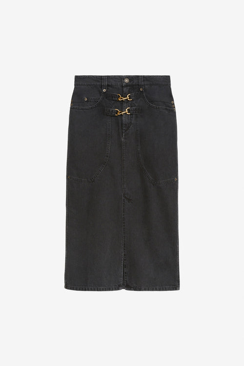 Denim midi skirt with snap hooks